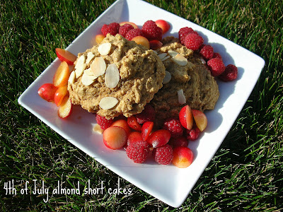 Combine wet ingredients into the dry ingredients and mix until combined. On a non stick coated baking sheet make giant drops of dough. Sprinkle over the top raw sliced almonds and a sprinkle of raw sugar. Bake at 350 degrees for 12 min.